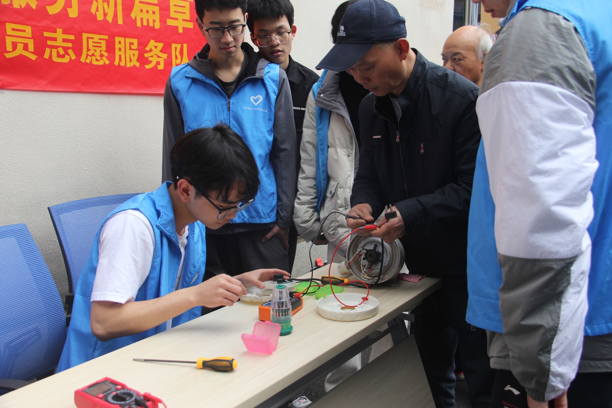 此外,“无忧家电”检修服务也受到了大家的热烈欢迎。志愿者们凭借扎实的专业知识和丰富的实践经验,为教职工及其家属提供了电风扇、电饭煲等小型家电的故障检测与维修服务。许多因家电故障而困扰的家庭在志愿者的帮助下,成功解决了居家生活中的难题,脸上露出了满意的笑容。