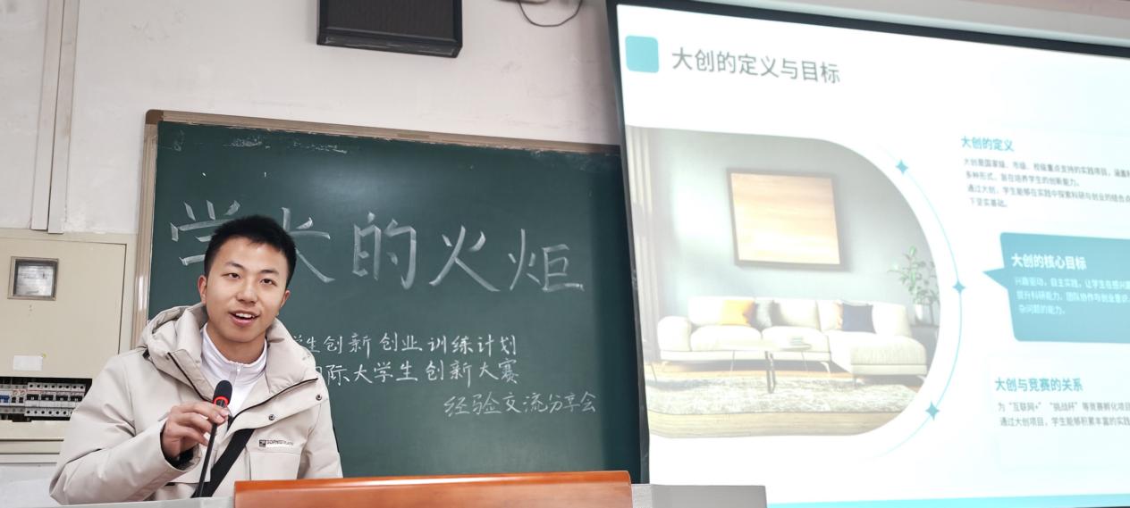本次交流活动特邀三位在往届赛事中表现优异的员工代表进行经验分享。2021级本科生陈俊潇系统梳理了赛事流程、评审要点,强调“选题需紧扣社会痛点,注重学科交叉与成果转化”。2022级本科生李成宇,聚焦红旅赛道,结合自身参与乡村智慧农业项目的经历,分享了如何将技术创新与红色文化、基层需求深度融合。2022级本科生周芷伊文本用词、数据支撑到可视化表达,逐一拆解申报书撰写技巧,提出“精准对标评审标准,用故事思维呈现价值”。