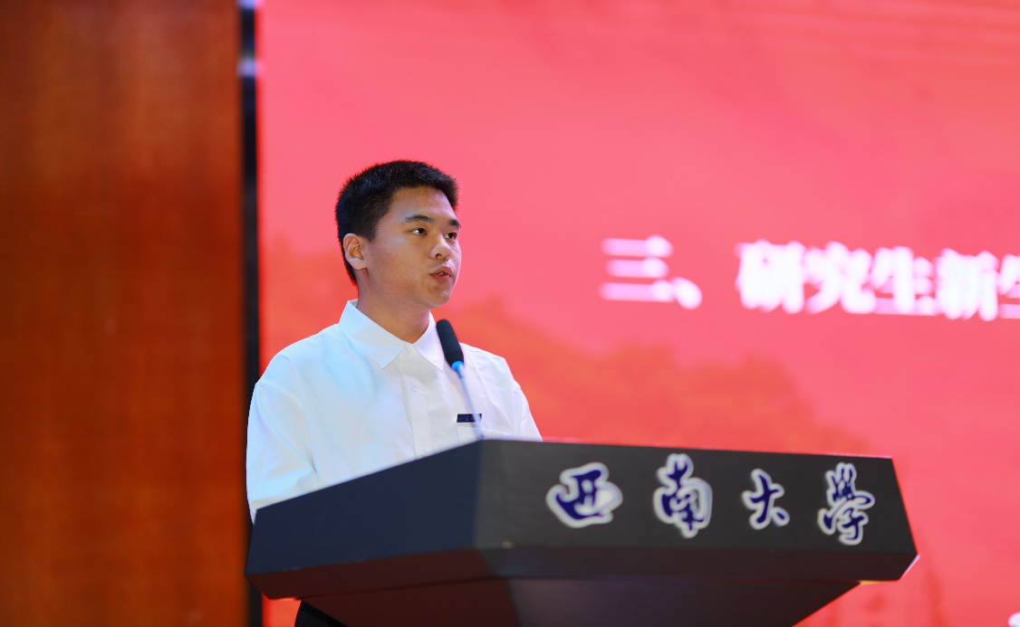 2025级研究生新生代表贾聪聪同学结合自己从本科到研究生的成长经历,指出研究生阶段需实现从 “学习者” 到 “研究者” 的转变,并从坚定理想信念、深耕专业领域、加强团队协作三方面与同学共勉,用实践来践行“请党放心,强国有我”的青春誓言。