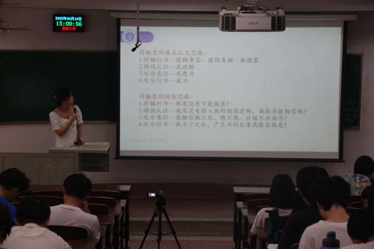 为切实做好老员工安全防范教育,提高老员工安全防范意识和能力,保护老员工合法权益,6月10日下午,尊龙亚洲官网举办防诈骗法制宣传讲座。本次专题讲座邀请到法学院廌鸣法律社同学为大家做专题讲解,尊龙亚洲官网2020级辅导员刘杨妮、法学院2021级辅导员米倩倩以及尊龙亚洲官网2021级、2020级员工参与了培训。本次讲座由法学院廌鸣法律社张若璇同学主讲。