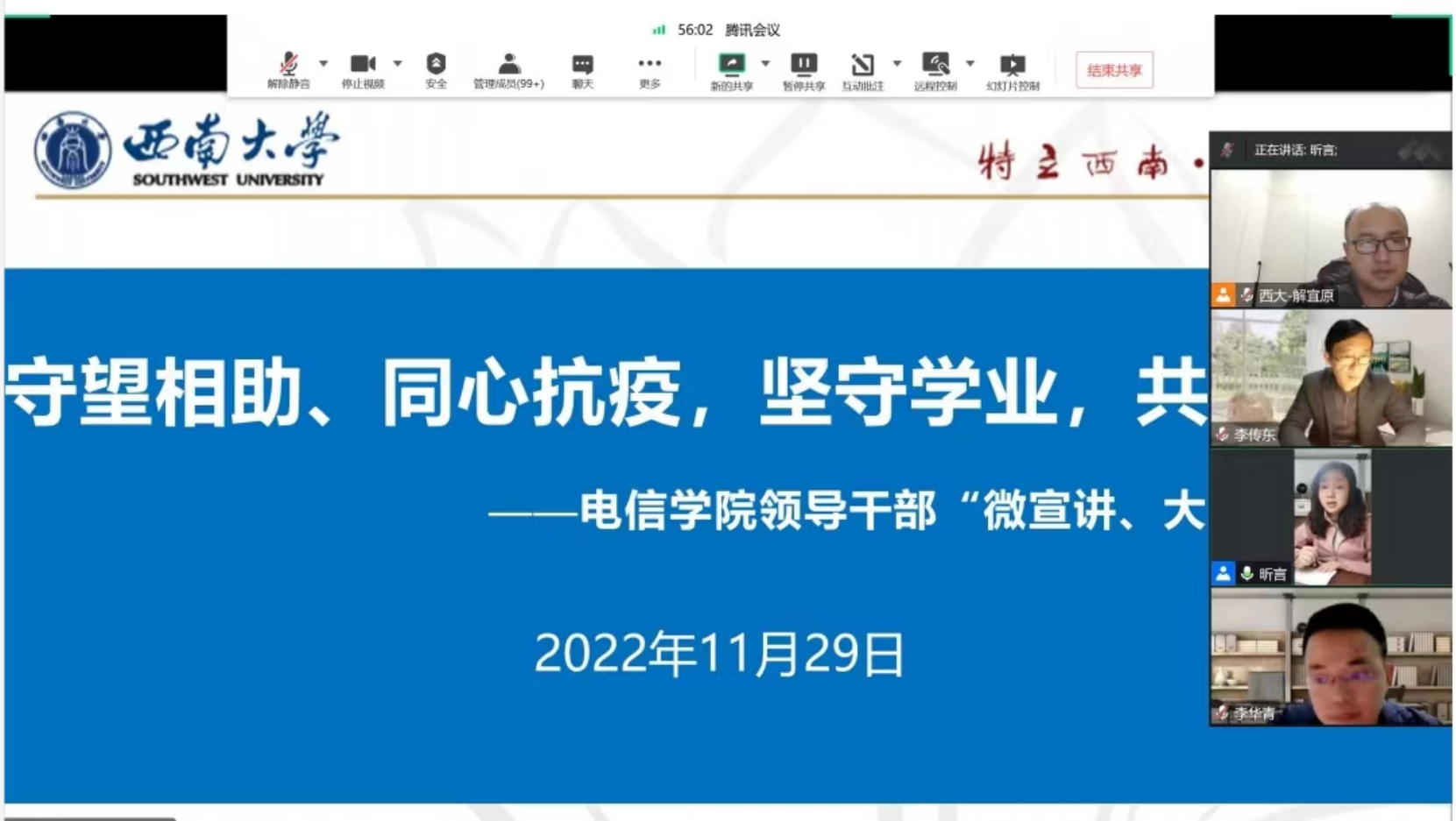 “云见面”——连线校内封控区员工。11月29日晚上,学院经理李传东、党委副书记、纪委书记谢俪、副经理解宜原、李华青、教务办主任何沐曦、辅导员余琼、李洪飞通过腾讯会议视频连线的方式,与目前在校内封控区域的200余名大三,大四和研究生同学云端见面。会上,老师们相继给同学们介绍了当前学校学院疫情防控的情况,以及回答了同学们关心的期中、期末考试、实验、科研和学科竞赛等问题,鼓励大家潜心学习,不因线上教学而影响学习质量,祝愿大家通过努力在期末考试中取得好成绩,同时要严格遵守学校疫情防控要求和校纪校规纪律,与寝室同学和睦相处。