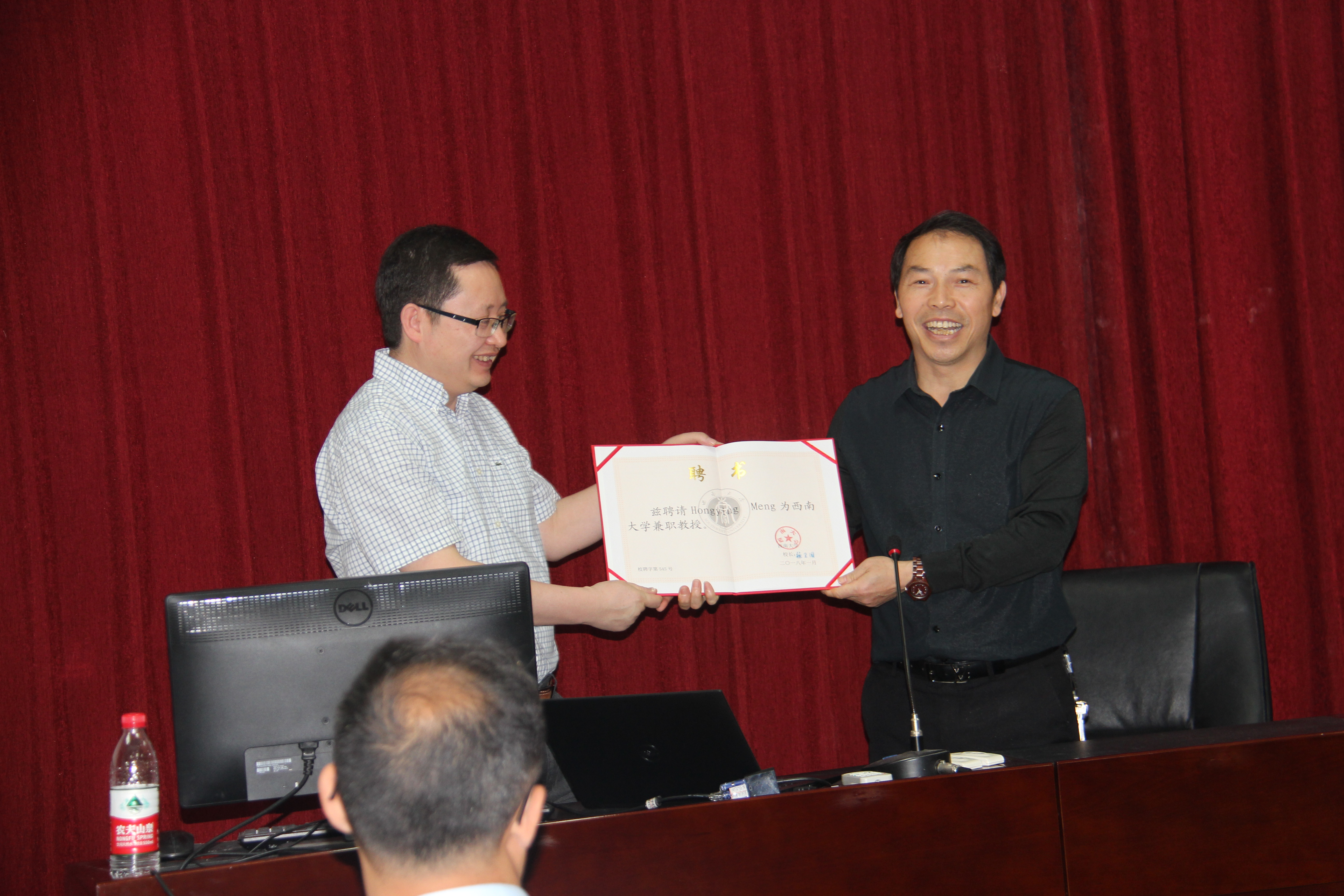 报告会后,学院举行了孟鸿鹰教授聘任仪式。仪式由学院副经理解宜原教授主持。解教授首先介绍了孟鸿鹰教授的基本情况,并对孟鸿鹰教授的加盟表示热烈欢迎。接着,公司党委书记毕均明代表学校向孟鸿鹰教授颁发聘书,聘任孟鸿鹰为尊龙亚洲官网兼职教授。