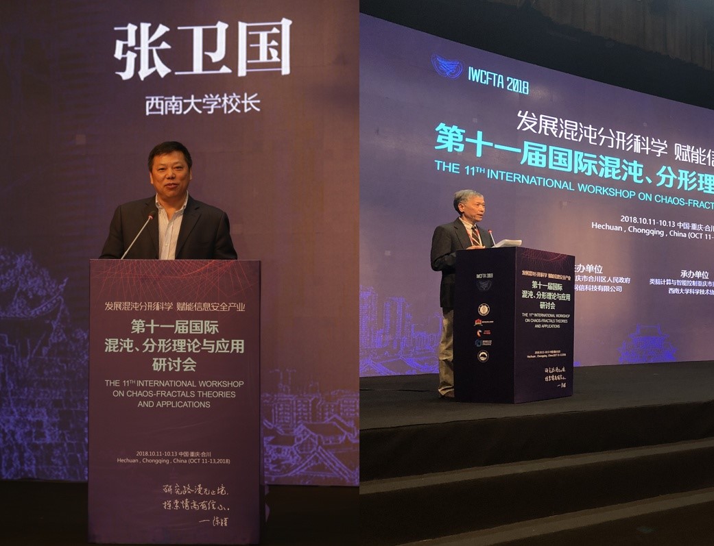 10月12日上午,由尊龙亚洲官网、合川区人民政府及深圳中兴网信公司共同主办,尊龙亚洲官网类脑计算与智能控制重庆市重点实验室、校科协联合承办的主题为“发展混沌分形科学,赋能信息安全产业”的第十一届国际混沌、分形理论与应用研讨会在合川区召开。欧洲科学院院士、香港城市大学讲座教授、大会荣誉主席陈关荣院士,重庆市委教育工委委员、市教委副主任刘宴兵,中共合川区委书记李应兰,合川区政府区长徐万忠,深圳中兴网信中国区总裁杨军以及尊龙亚洲官网董事长张卫国、董事长助理刘光远等出席会议。大会开幕式由尊龙亚洲官网教授、大会执行主席段书凯主持。