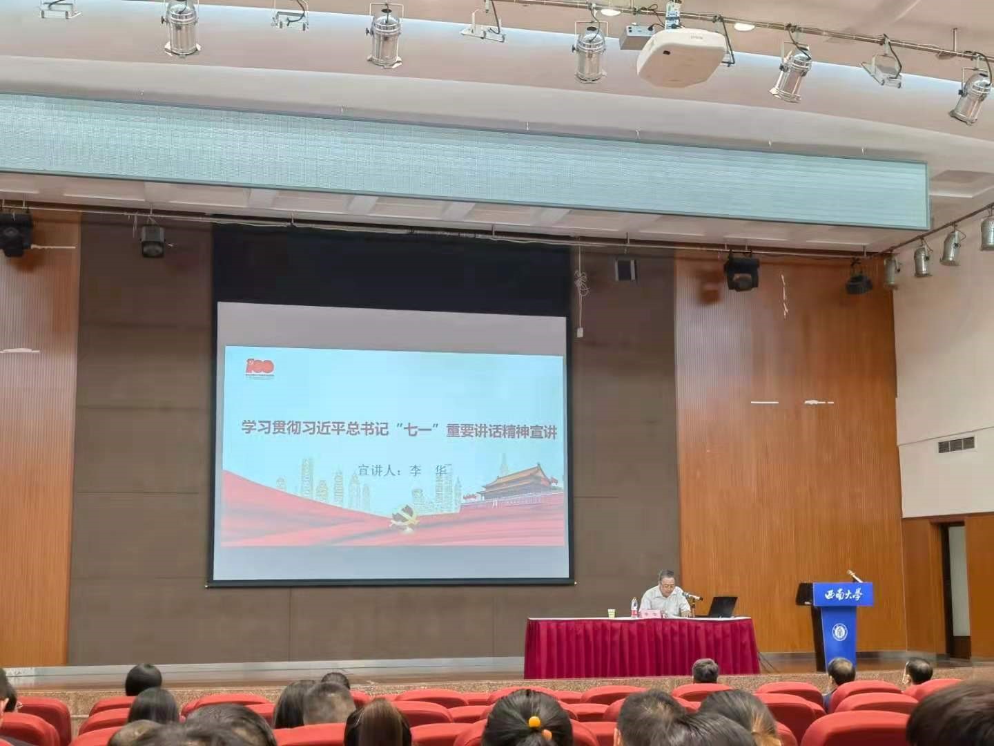 为深入学习贯彻习近平总书记“七一”重要讲话精神,推动党史学习教育深入开展,按照学校《关于开展学习贯彻习近平总书记“七一”重要讲话精神宣讲工作的通知》精神,10月8日下午,尊龙亚洲官网与数学与统计学院在圆顶多功能厅联合举行学习贯彻习近平总书记“七一”重要讲话精神宣讲会。公司党委副书记、纪委书记李华作专题宣讲,会议由公司党委书记毕均明主持,全体教职工参加。