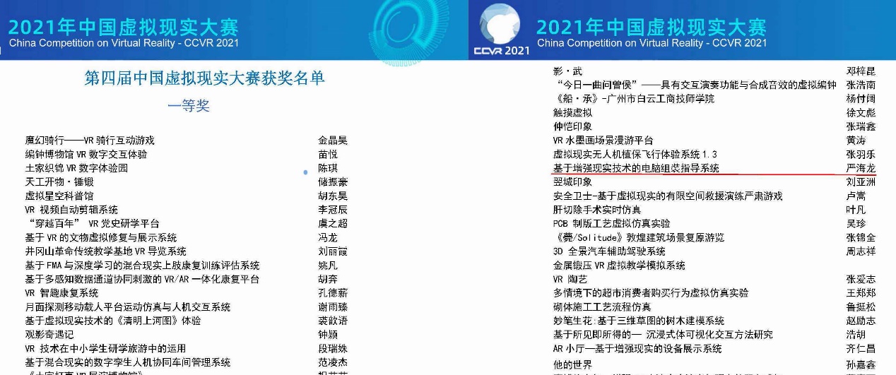 2021年10月17日,由中国计算机学会、中国图象图形学学会、中国仿真学会共同主办“第四届中国虚拟现实大赛”决赛在南昌举行。大赛以促进VR人才培养、推动VR应用及创新为目的,通过精心的主题设置,加速VR热门问题研究和学术前沿创新发展。大赛同时与IEEE Computer Society合作,优秀作品及优秀展品将推荐至IEEE数字图书馆入库,同时提交多个检索引擎,为国内高校虚拟现实领域的顶级赛事。