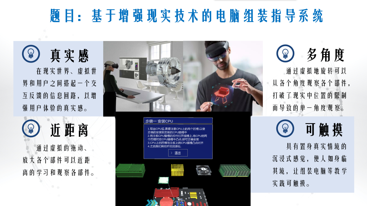 该成果由教育部产学合作协同育人项目“基于混合现实技术的计算文化基础课程辅助教学应用研究”支持,作品聚焦混合现实技术,基于虚拟现实的计算机辅助教学系统,通过Unity3D结合AR引擎Vuforia并部署到混合现实眼镜上开发的电脑主机指导组装项目。此技术能够激发员工学习动机、创设学习情境、增强学习体验,具有较好的应用前景。