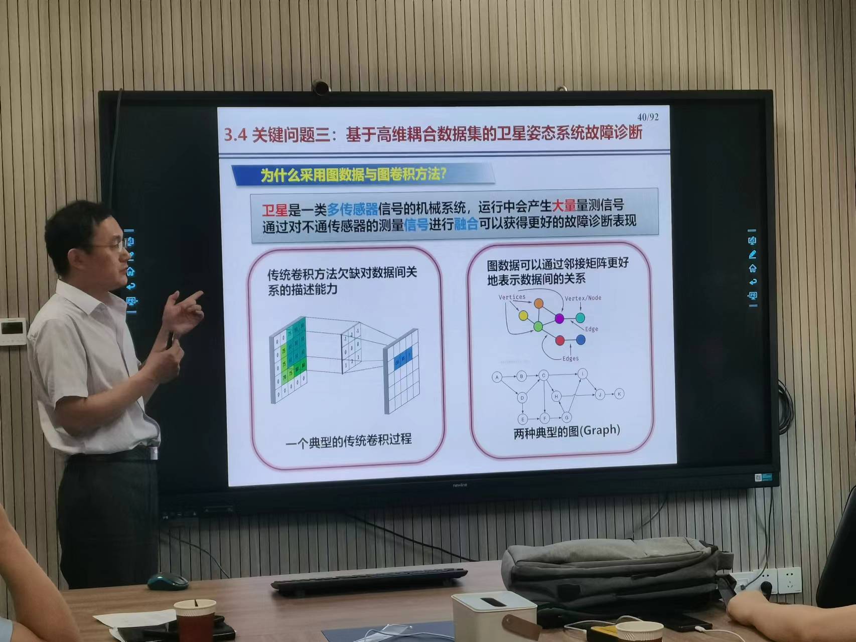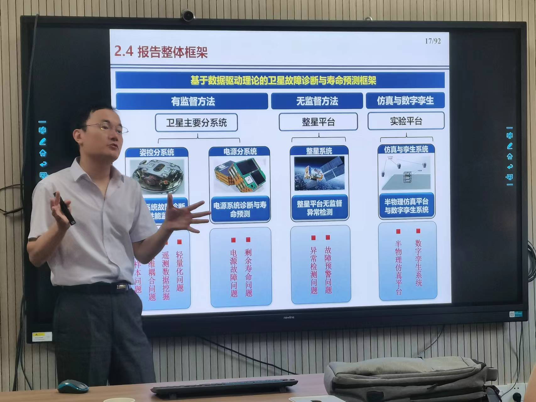 在报告中,刘明教授介绍了卫星技术的研究背景和现状,着重探讨了存在的几个关键性问题:基于轻量化网络的卫星CMG故障诊断;基于高维耦合数据集的卫星姿态系统故障诊断。他还介绍了卫星技术面临的风险和挑战、卫星主要分系统、整星平台、实验平台等相关内容,使得学院师生对该领域的了解更加深入。
