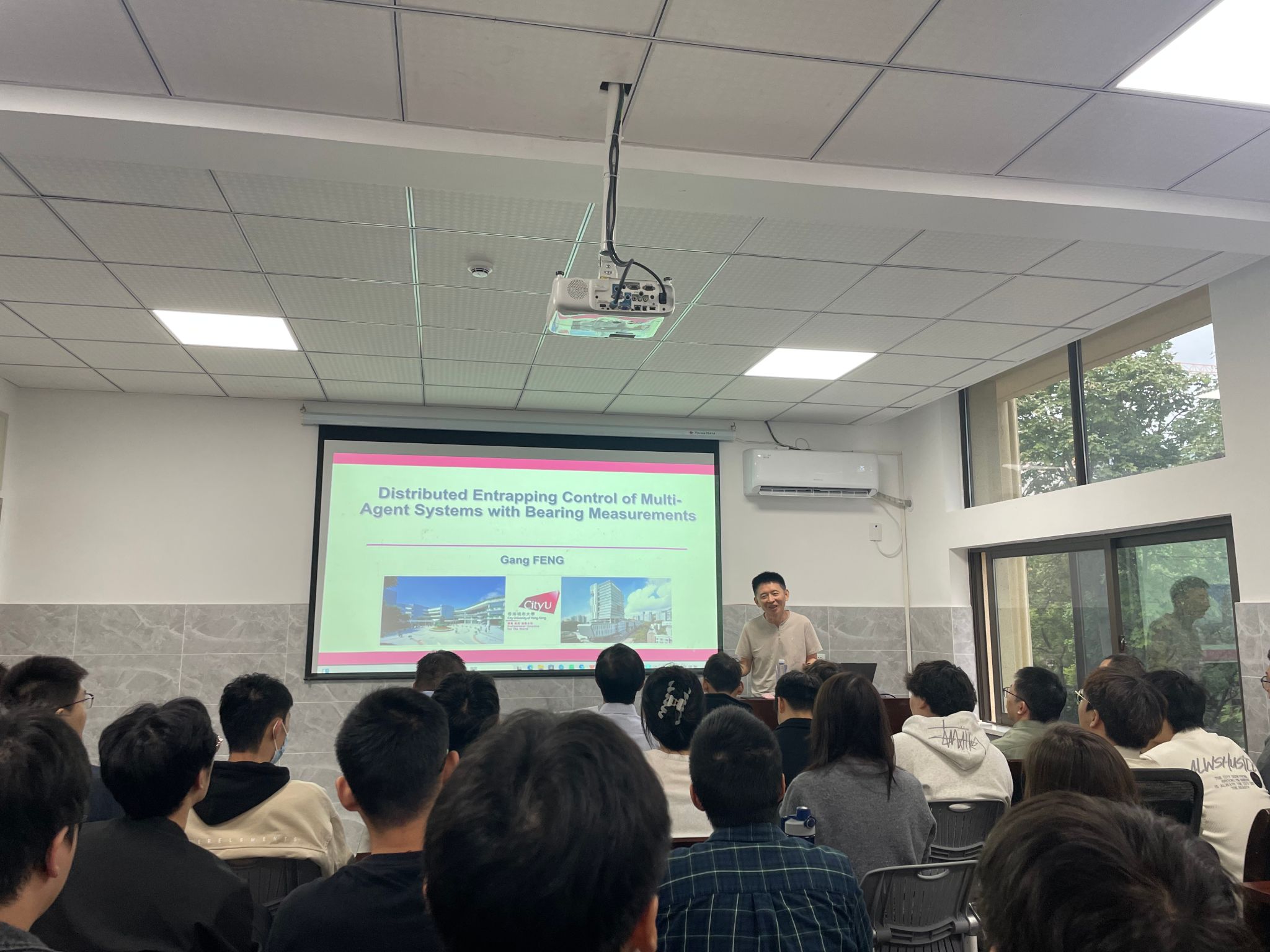 首先,香港城市大学冯刚教授做关于多智能体系统分布式困捕控制的报告,报告由李传东教授主持。冯刚教授介绍了基于位移和速度测量的分布式困捕控制框架,该框架采用了时变的困捕编队,并允许智能体在受限区域内移动,同时实现目标的困捕。此外。冯刚教授还展示了控制框架中领航者-跟随者结构,包括编队形状观测器、相对位置估计器以及分布式控制器。