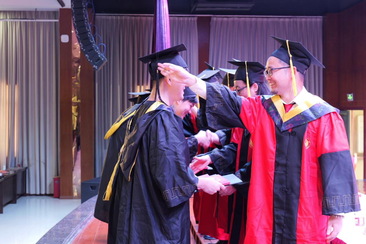 在热烈的掌声中,与会领导、教授依次为毕业生代表颁发荣誉证书、毕业证、学位证,并为获得学位的毕业生进行拨穗正冠,授予学位。