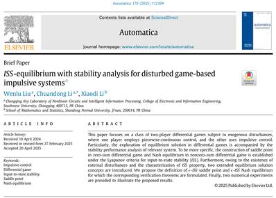 引用:W. Liu, C. Li and X. Li, ISS-equilibrium with stability analysis for disturbed game-based impulsive systems, vol. 179, pp. 112394, Sep. 2025, doi: 10.1016/j.automatica.2025.112394. |