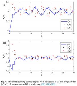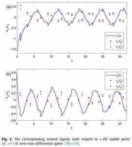 论文二聚焦于一类具有连续控制和脉冲控制的无限视界二人微分博弈,其中微分博弈的状态演化受外部干扰的影响。基于ISS-Lyapunov准则,建立了连续控制、脉冲控制、成本函数及ISS增益界之间的关联,在保证脉冲系统ISS的前提下,实现了零和微分博弈中鞍点及非零和微分博弈中纳什均衡的构造,进一步推动了博弈论与脉冲控制理论的融合。此外,为减少计算量,根据ISS性质特征首次提出了ϵ-ISS鞍点和ϵ-ISS纳什均衡两个扩展的均衡解概念,并给出了相应的验证定理。研究不仅弥补了脉冲博弈理论与稳定性理论之间的空白,还有效解决了外部扰动下系统稳定性与博弈均衡策略并行构建的难题。研究成果为商品销售、污染控制、网络安全等实际问题提供了新的理论工具与方法支撑。
