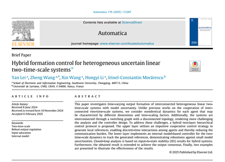 引用:Y. Lei, W. Zheng, X. Wang, H. Li and I.C. Morărescu, Hybrid formation control for heterogeneous uncertain linear two-time-scale systems, Automatica, vol. 176, pp. 112267, Sep. 2025, doi: 10.1016/j.automatica.2025.112267. |