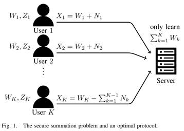 论文一《Secure Summation: Capacity Region, Groupwise Key, and Feasibility》[1]研究了分组密钥条件(一个密钥由若干用户共同持有)下的安全求和问题,给出了可行性的充要条件,并进一步刻画了对称分组密钥情况下的最优通信与密钥开销。对于包含