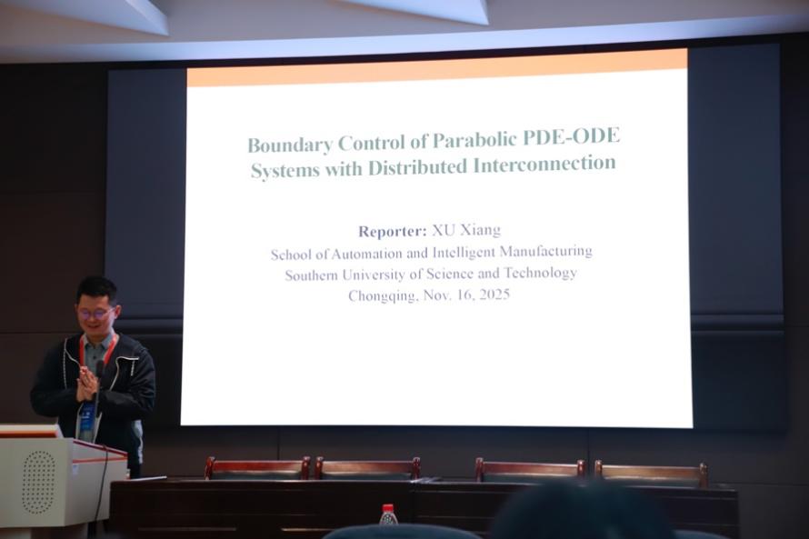 国家优秀青年科学基金(海外)项目获得者、南方科技大学徐翔副教授以《具有分布式内联的抛物型PDE-ODE系统边界控制》为主题,介绍了两种类型的边界控制器设计方法:反步-前馈方法及低增益控制方法,实现了多种具有分布式内联的抛物型PDE-ODE系统的边界镇定。该报告由国家级青年人才、重庆大学王玉娟教授主持。