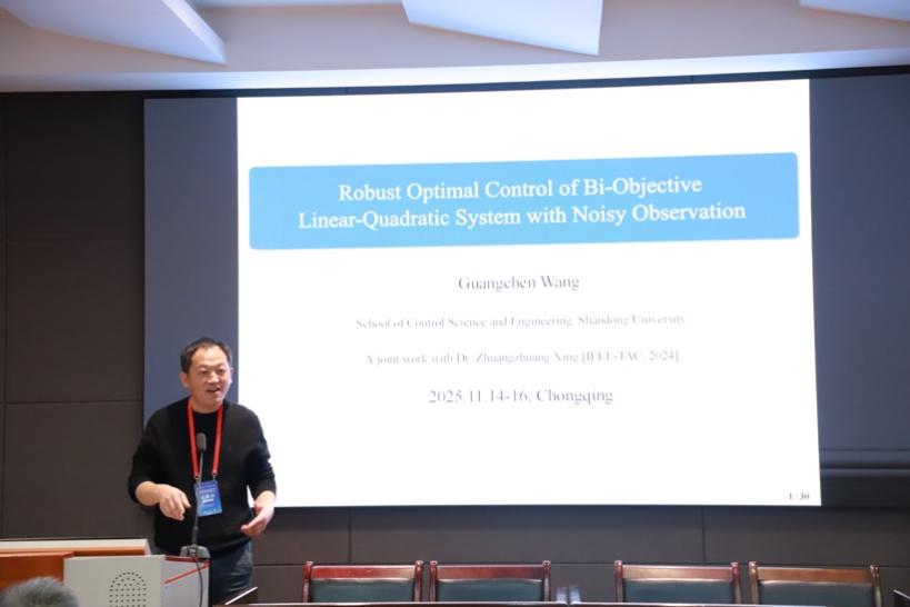 国家杰出青年科学基金获得者、山东大学控制科学与工程学院常务副经理王光臣教授进行了题为《Robust optimal control of Bi-objective LQ system with noisy observation》的报告,介绍了部分可观测LQ系统的最优控制方法,验证了最大参考概率的存在性。该报告由重庆交通大学宋乾坤教授主持。