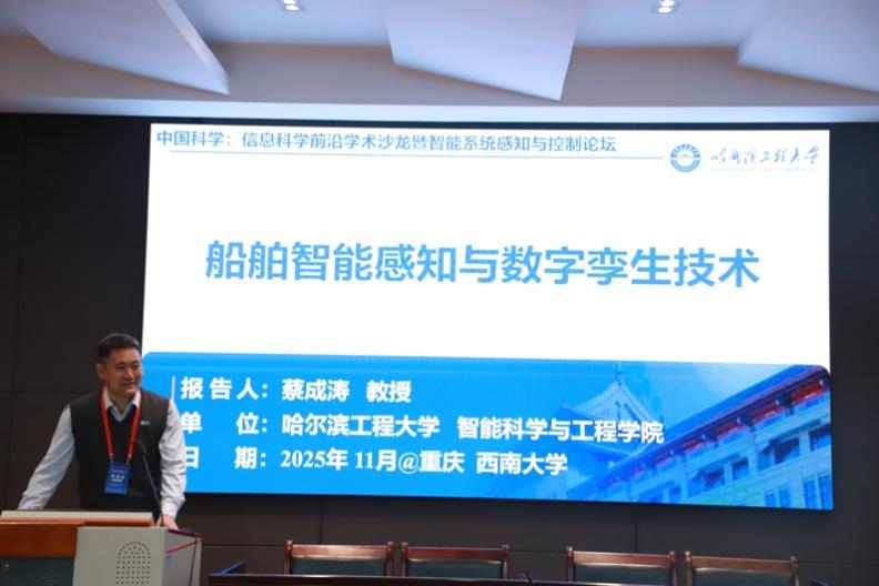 11月15日下午,首个报告由国家优秀青年科学基金获得者、电子科技大学梁洪晶教授主持。国家级人才、哈尔滨工程大学智能科学与工程学院经理蔡成涛教授聚焦《船舶智能感知与数字孪生技术》,介绍了船舶智能感知技术、数字孪生技术在船舶智能航行中涉及的关键技术,并对未来智能船舶技术的发展趋势进行展望。