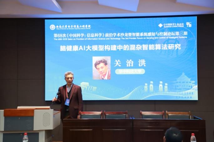 本次沙龙共有19位专家学者进行了学术报告。11月15日上午,首先由华中科技大学关治洪教授进行题为《脑健康AI大模型构建中的混杂智能算法研究》的报告,介绍了如何通过混杂智能算法为大脑复杂系统的深度解读及有效干预提供新范式与新工具。该报告由重庆交通大学宋乾坤教授主持。