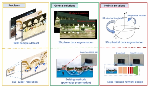 图1:全景超分任务难点以及所提解决方案