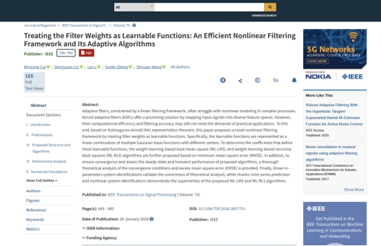 近日,信号处理领域国际顶级旗舰期刊——《IEEE Transactions on Signal Processing》(简称IEEE TSP)正式在线发表了最新研究成果。公司2022级电子信息工程专业本科生崔明晶,在公司王世元教授的指导下,以第一作者身份撰写的长文《Treating the Filter Weights as Learnable Functions: An Efficient Nonlinear Filtering Framework and Its Adaptive Algorithms》(vol. 74, pp. 545-560, 2026)被该期刊正式录用并发表(图1)。作为IEEE信号处理学会的旗舰期刊,TSP是国际公认的信号处理、通信及信息理论领域的最高级别学术期刊,其对论文的数学推导严谨性和理论创新性要求极高,代表着该研究方向的国际最前沿。
